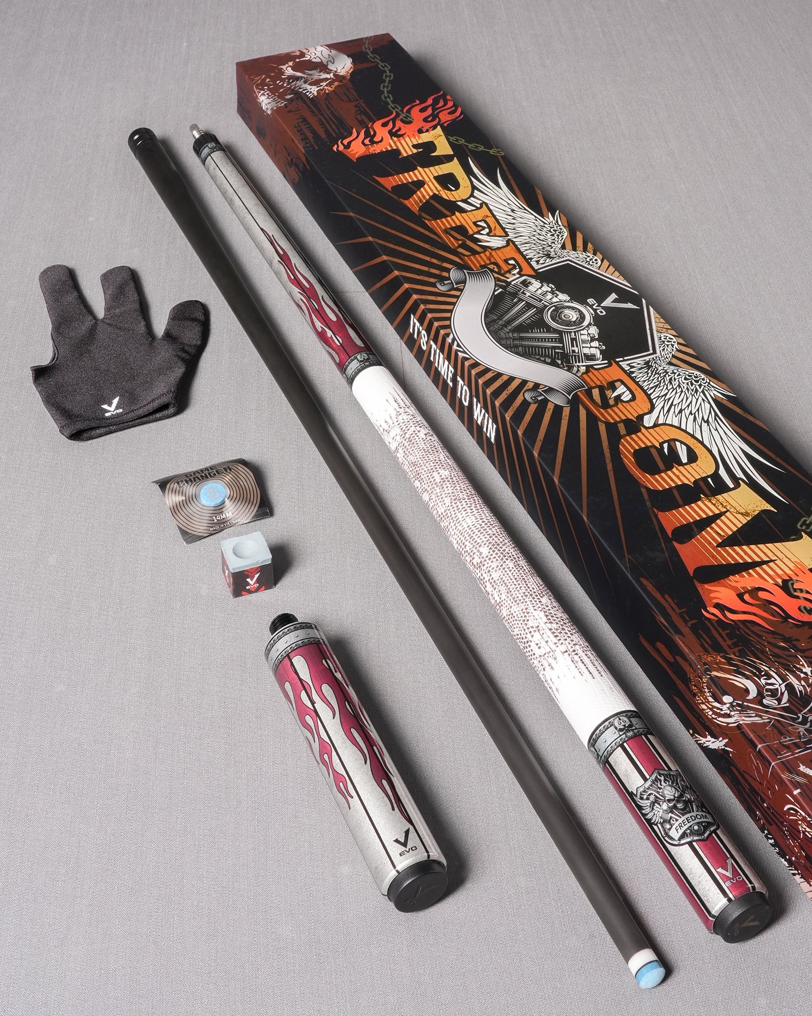 Premium playing cue + 6" extension + Time Tip + glove + chalk. All essentials for your game in one package.