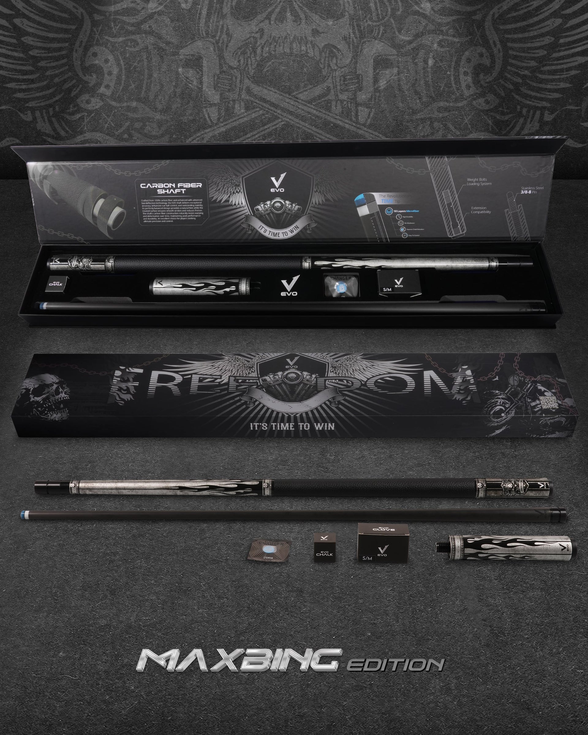 Premium playing cue + 6" extension + Time Tip + glove + chalk. All essentials for your game in one package.