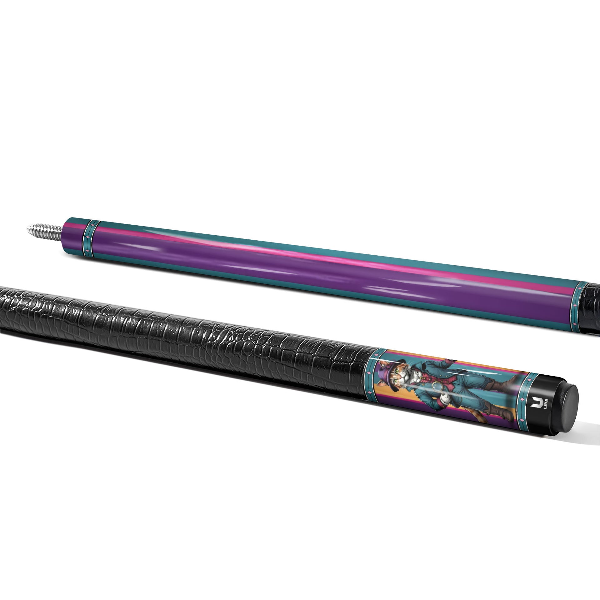 📜 VICTORIAN STEAMPUNK ARTISTRY: Embrace a world of mystery and class. Featuring a dapper tabby cat in a Full Victorian Suit, complete with a monocle, top hat, and walking cane. The design is framed by majestic vertical stripes of Deep Teal, Royal Purple, and Sunset Orange, creating a rich, textured look that commands respect in any pool hall.